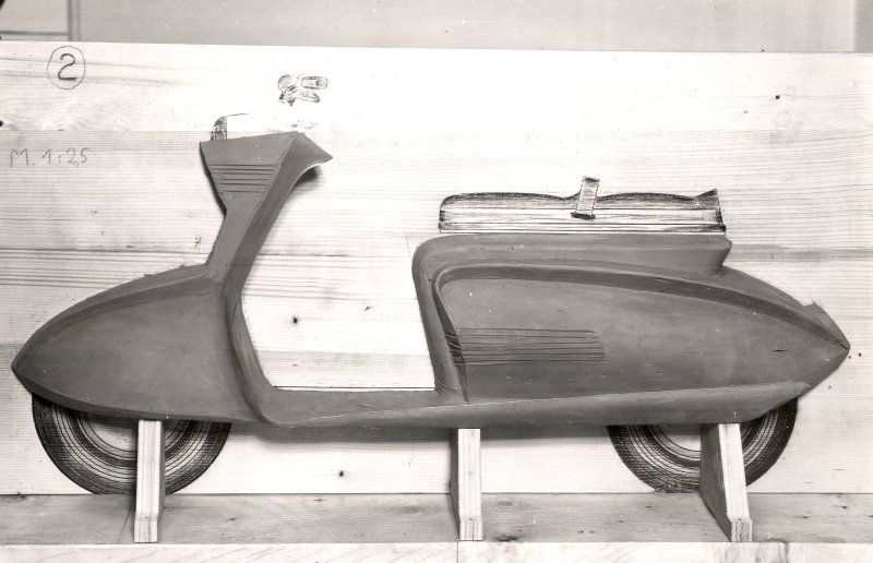 Gegenüber dem Holzmodell wurden bei diesem Prototyp noch die seitlichen Verkleidungen geändert. Die Hupe wurde versetzt und man montierte ein Rücklicht. Während die vorderen Blinker wie Fremdkörper wirken passen die hinteren Blinker ins harmonische Gesamtbild. Die Vorderradschwinge ist gut zu erkennen und am Hinterrad hat man wohl eine Einarmschwinge rechts vorgesehen. Für die damalige Zeit ein sehr fortschrittlicher Entwurf, der aber eher futuristisch anmutet.